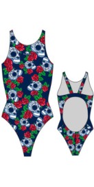 Découvrez notre maillot de natation femme haut de gamme, alliant style unique et performance sportive. Ce modèle exclusif Turbo, orné d'un motif tendance associant roses et têtes de mort, est idéal pour les nageuses exigeantes.